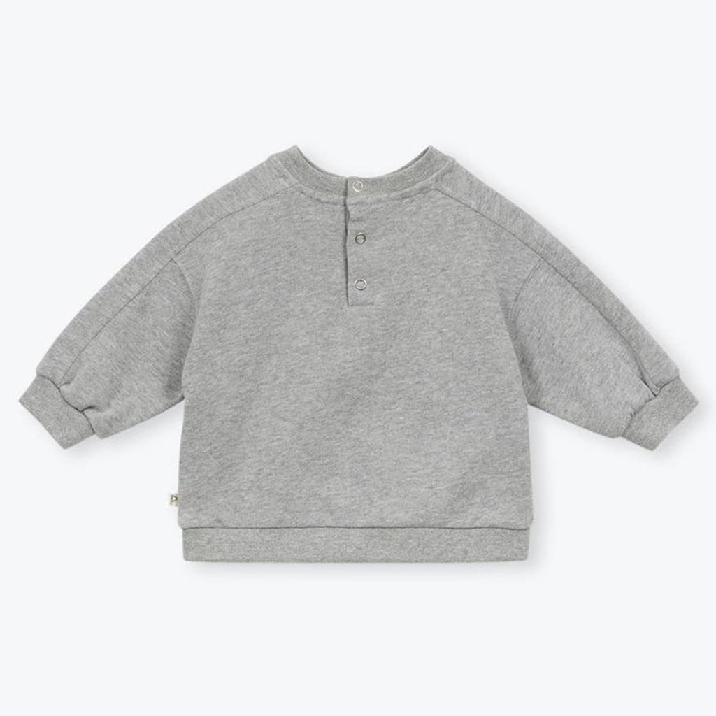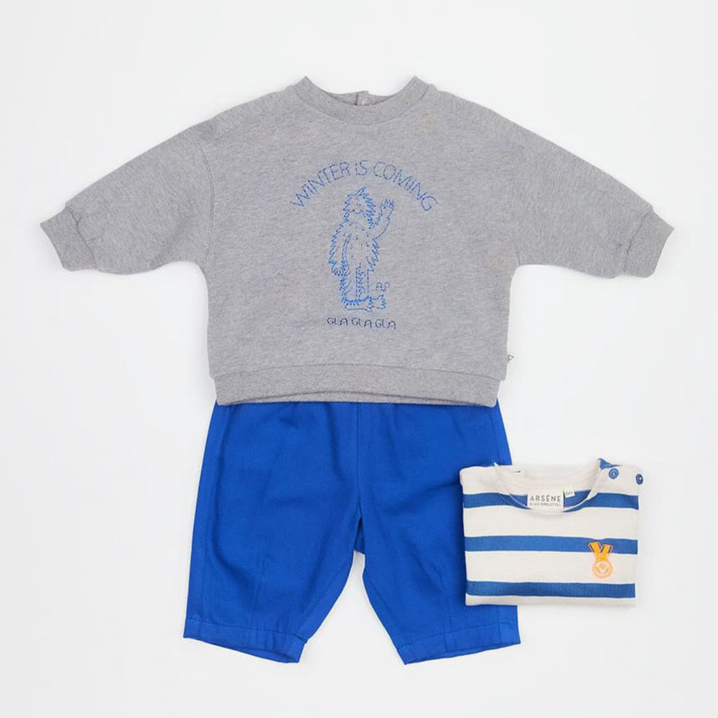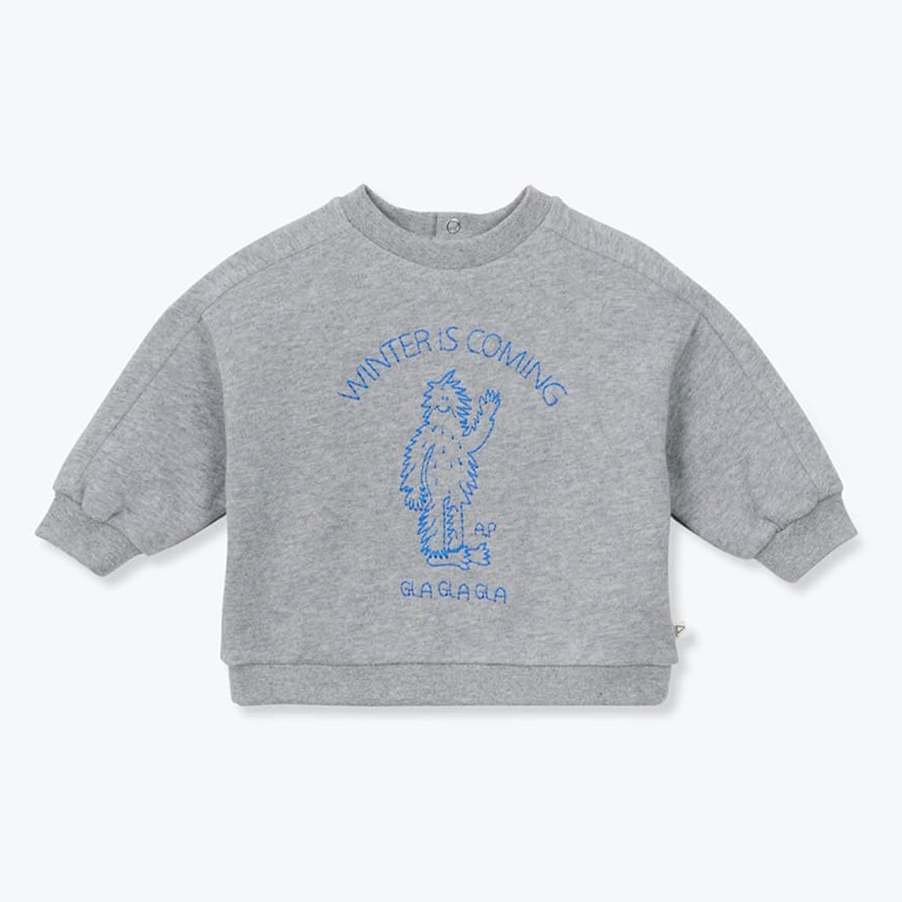 Details: loose-fit baby sweatshirt in heather grey, crafted from soft brushed organic cotton fleece. Designed with a round neckline and a back opening with snap buttons. The front is embroidered with “Winter is coming”.
