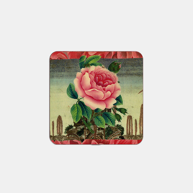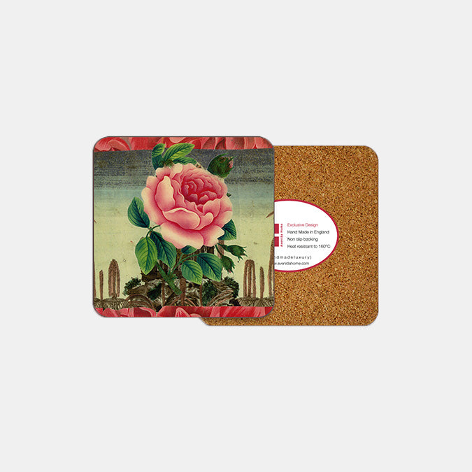 Details: Decorative coaster featuring a rose fountain motif, created in collaboration with John Derian. Finished with a protective melamine coating, a non-slip cork base and heat-resistant up to 160°C. Handmade in England. Do not submerge in water.