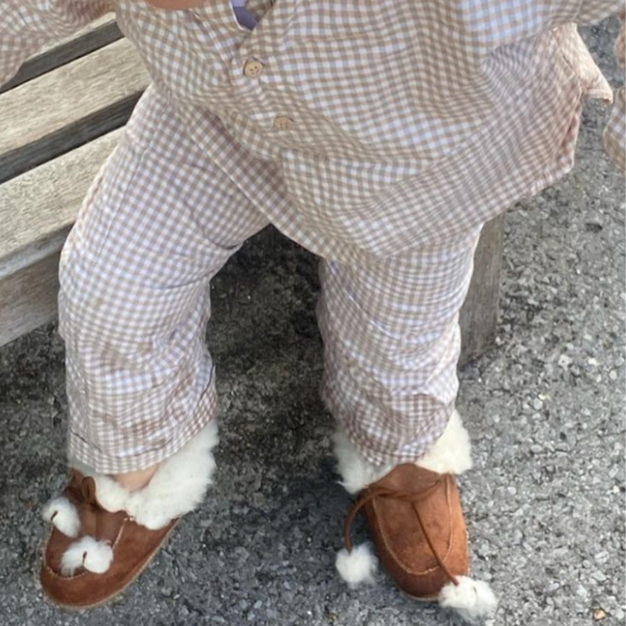 The Baby Sheepskin Bottines have a normal fit. They might feel slightly snug at first, but the wool naturally flattens over time. We recommend choosing their usual size.
